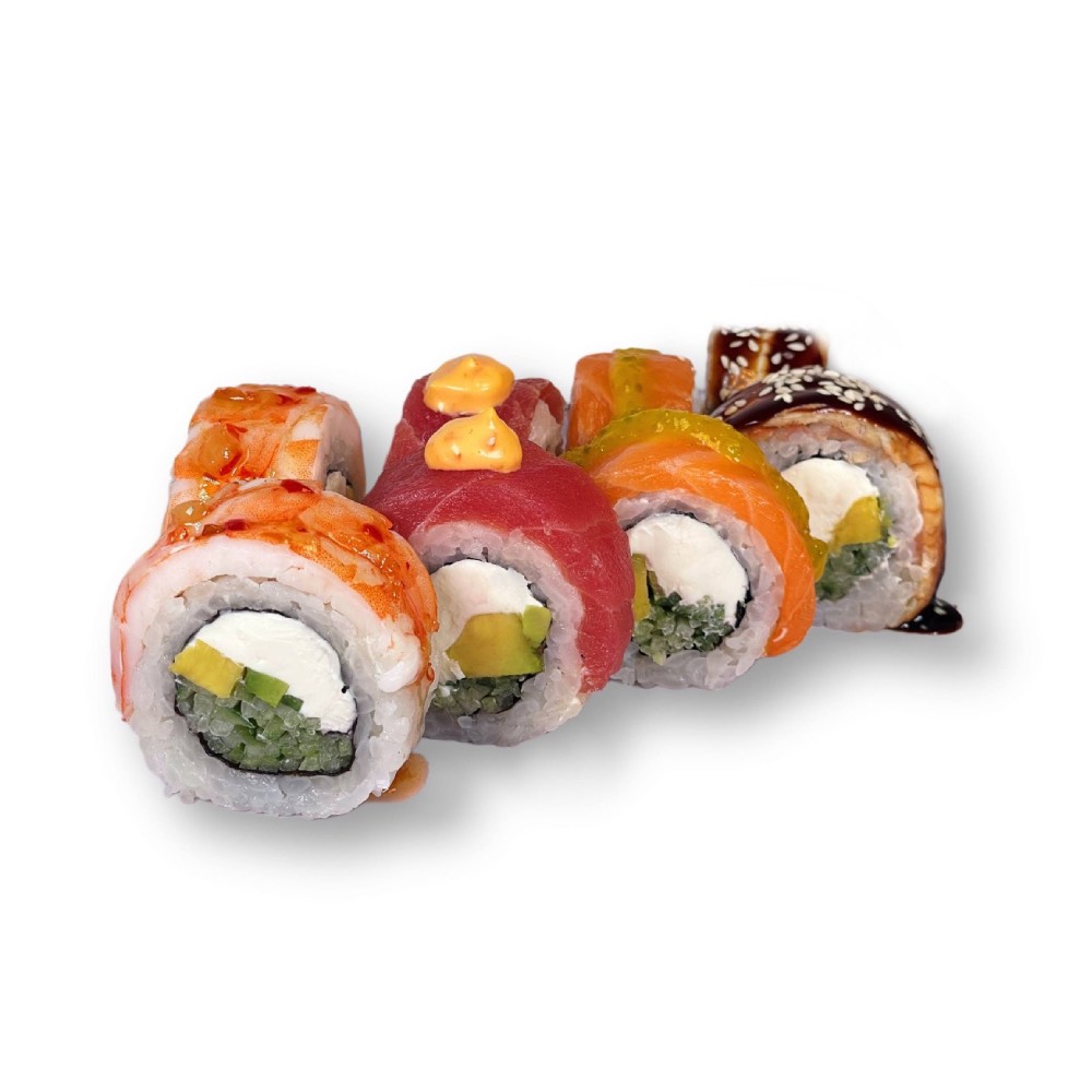 Це мікс чотирьох Філадельфій в одному ролі з крем-сира, авокадо, огірка та охолодженого лосося з манговим соусом, тунця із соусом SPICY, тигрової креветки з соусом Світ Чілі та копченого вугра з соусом унагі та кунжутом